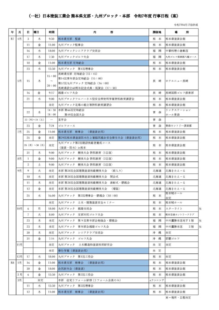 令和7年度 (一社)日本塗装工業会 熊本県支部 行事予定表